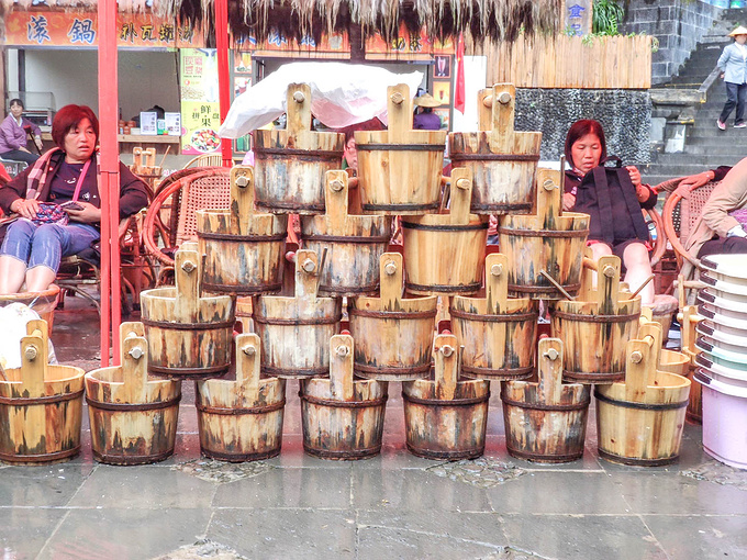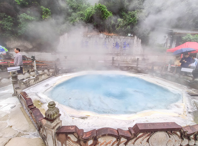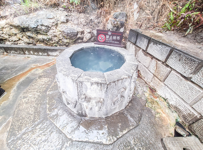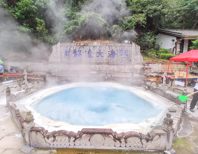 一直往上,沒過多久就到最大的熱禍,熱氣與濕氣同時相遇,煙霧雲繞。看到有工作人員從池子打撈過來的沸水,直接倒入小桶內,旁邊 也有一處免費代客煮蛋的服務告示,溫泉是這裡的特色,但99度的水不能直接泡,於是景區想出一個辦法 ,在旁邊的空地上建起了一處泡腳的地兒,找來技師和藥包等,形成了一個天然的按摩泡腳場,普通泡一次要四十元,加入藥包五十八,還有按摩等,都是明碼標價,自願消費。