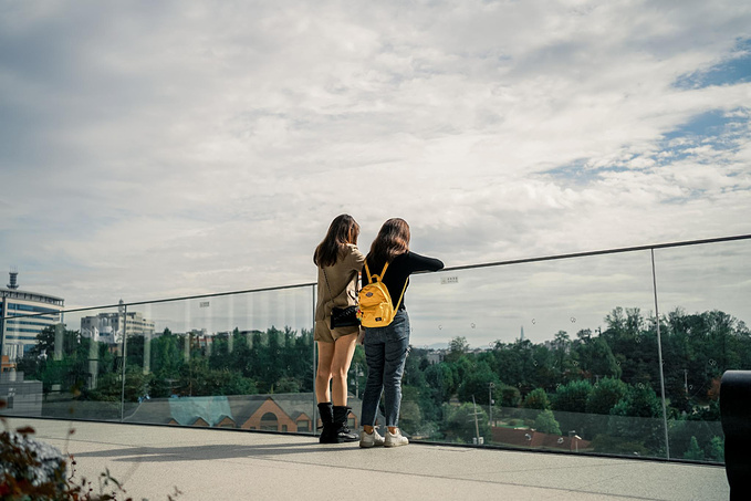 站在露天的陽臺廣場上,可以遠眺周圍的風景,深秋的陽光暖暖地照在身上,放眼四周,各種樹木環繞著,在秋天展現出不同的色彩,描繪出美麗的景色。