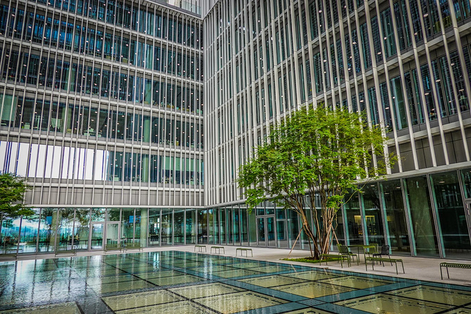 建築最大的特點就是位於建築內部的三個庭院——Roof Garden。在五樓、十一樓、十七樓處留出高達5~6層的大型空間,員工們不管在建築物的哪個角落工作都能與自然親近、並感受四季的變化,自在地溝通、放松休息。